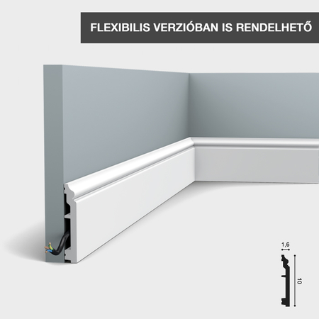 Modern formájú díszléc, melyben kábelek is elvezethetőek. Festhető, vízálló és könnyedén felrakható. 1 db szegélyléc mérete: 200 cm hosszú, 1,3 cm széles, 7,5 cm magas. Nemcsak lábazatnak, hanem fali és mennyezeti dekorelemnek is használható.
